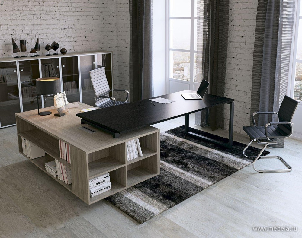 Рамочная система опор столов с тонкими столешницами и крупные тумбочки-опоры формируют необычный контраст в кабинете для руководителя. Пространство смотрится не только современно, но и остается предельно функциональным – владельцу не придется далеко ходить за нужными документами. Возможность пос...