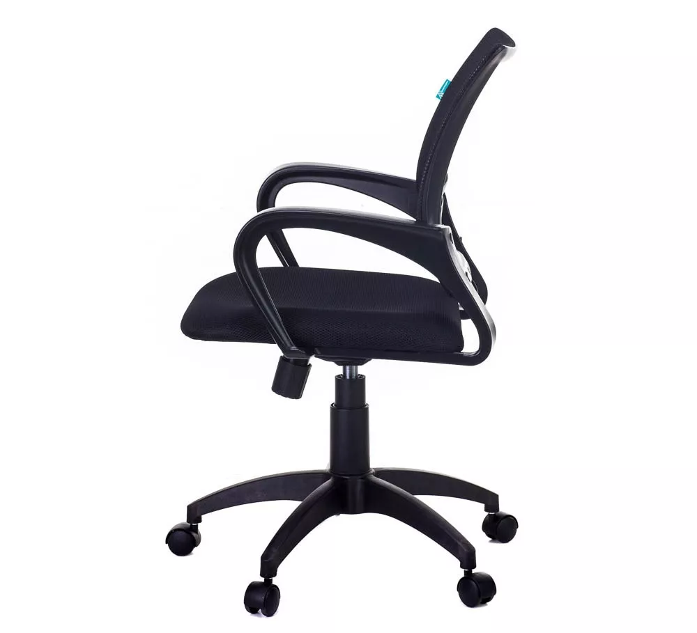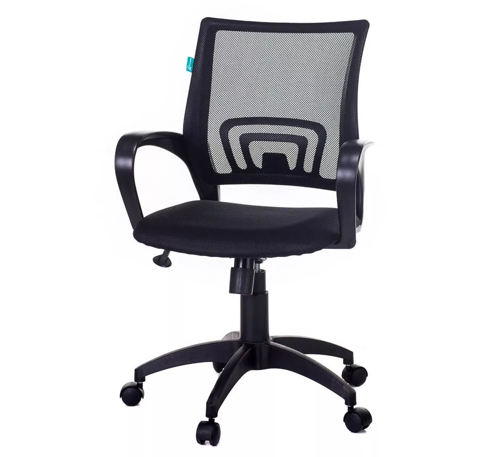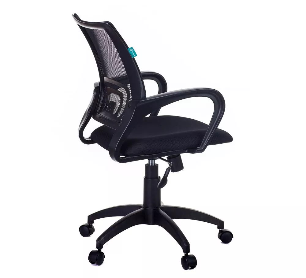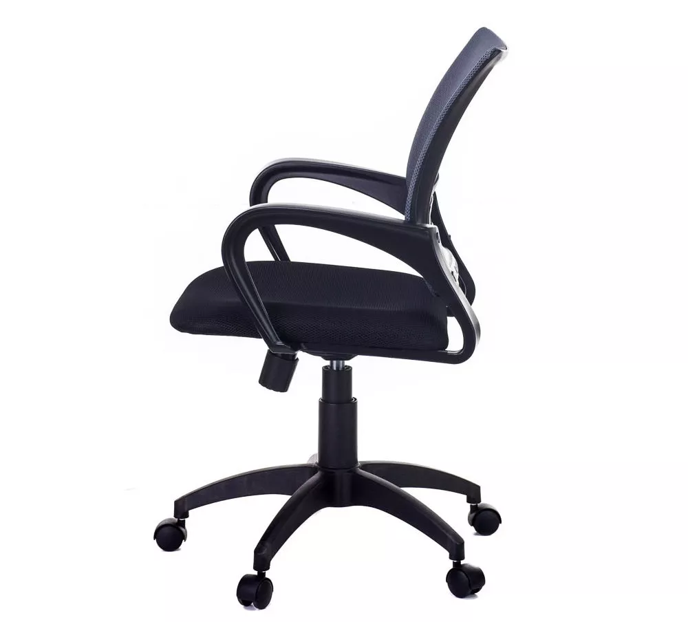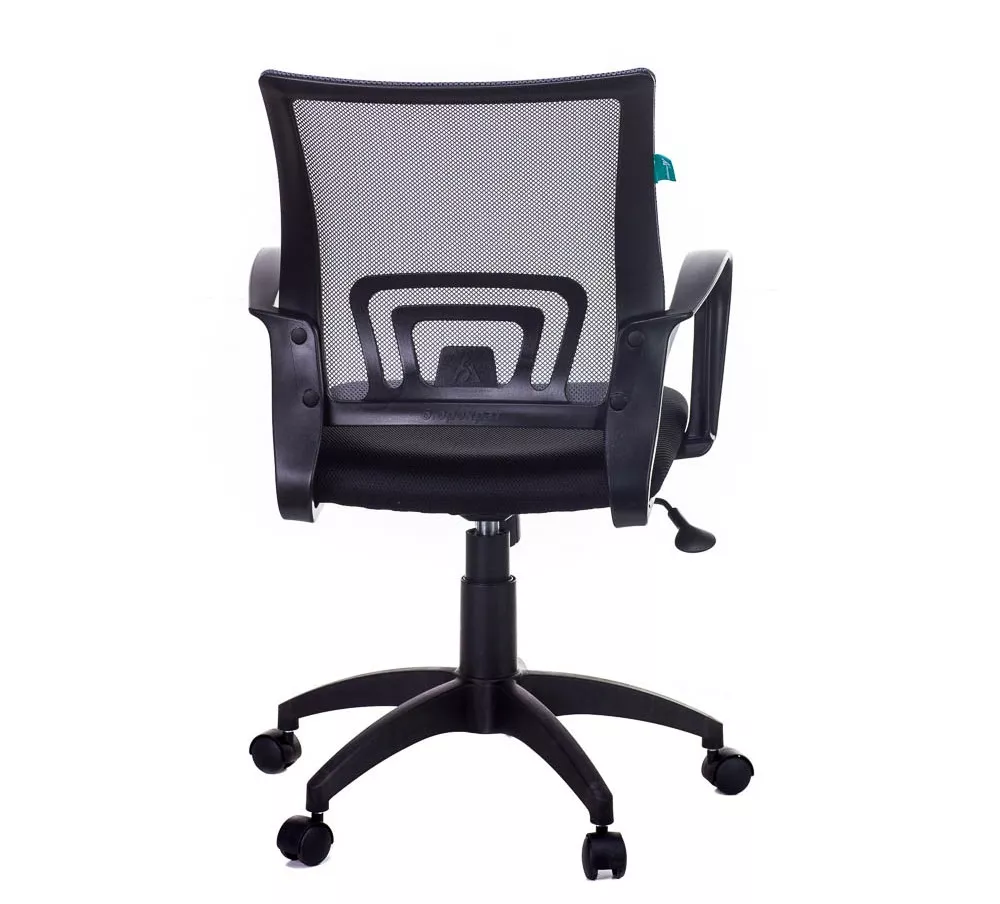Ткань черного цвета, которой обтянуто сидение кресла, отличается своей прочностью и износостойкостью. Предусмотрен механизм качания. Пятилучевая крестовина изготовлена из прочного пластика. В сочетании с поворотными колесиками, она позволяет креслу легко и бесшумно передвигаться по любому напольному покрытию. Ограничения - вес более 120 кг.