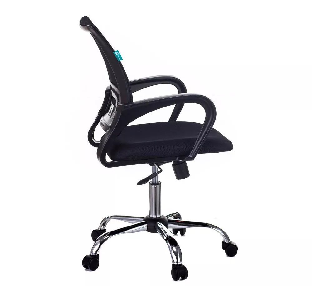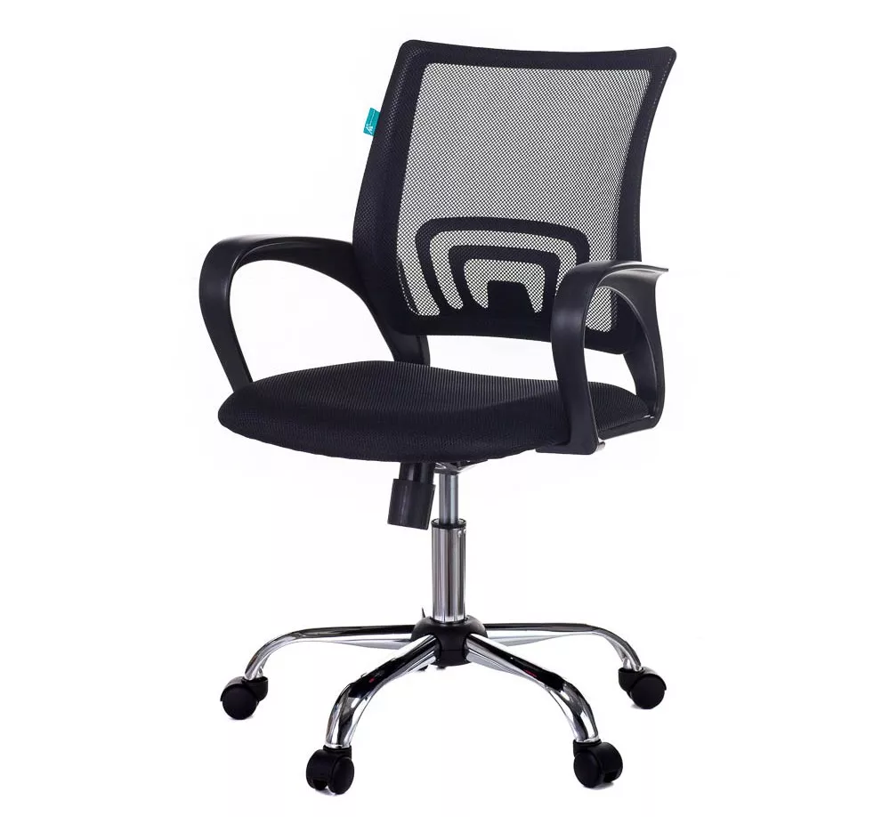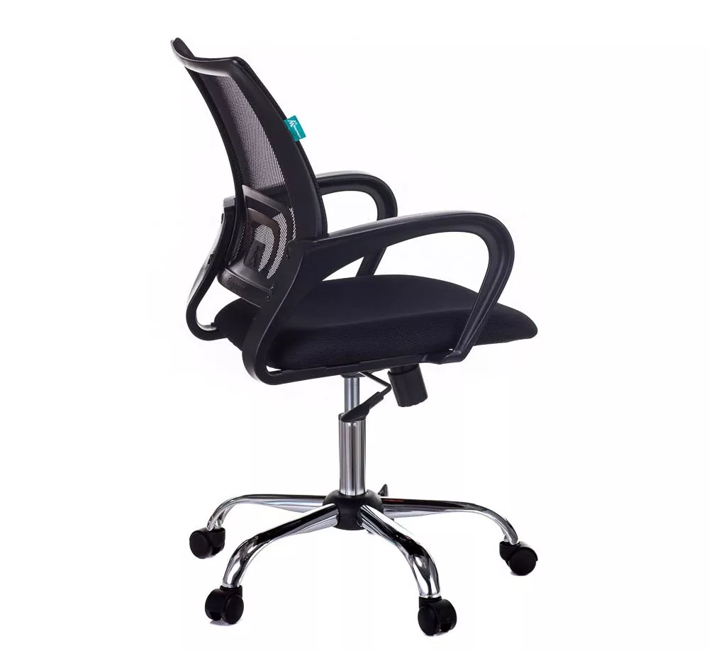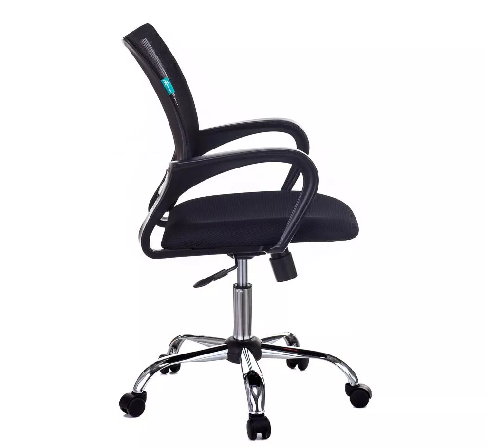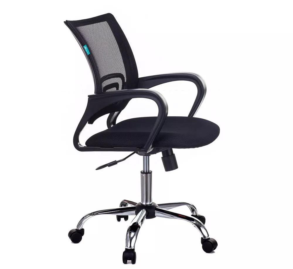 Хромированные элементы кресла выглядят стильно в любом интерьере. Для обивки сидения использована ткань, устойчивая к растяжению, истиранию. В лаконичный дизайн изделия прекрасно вписываются пластиковые подлокотники, которые будут очень удобными для владельца кресла. Хромированная пятилучевая крестовина с поворотными колесиками делает