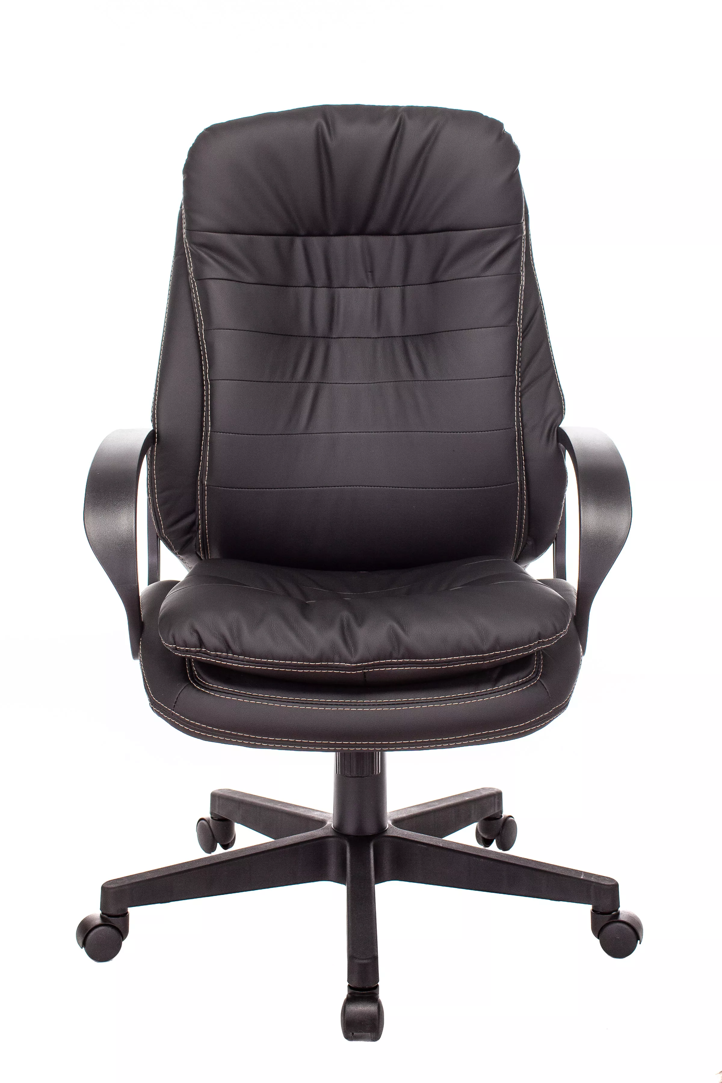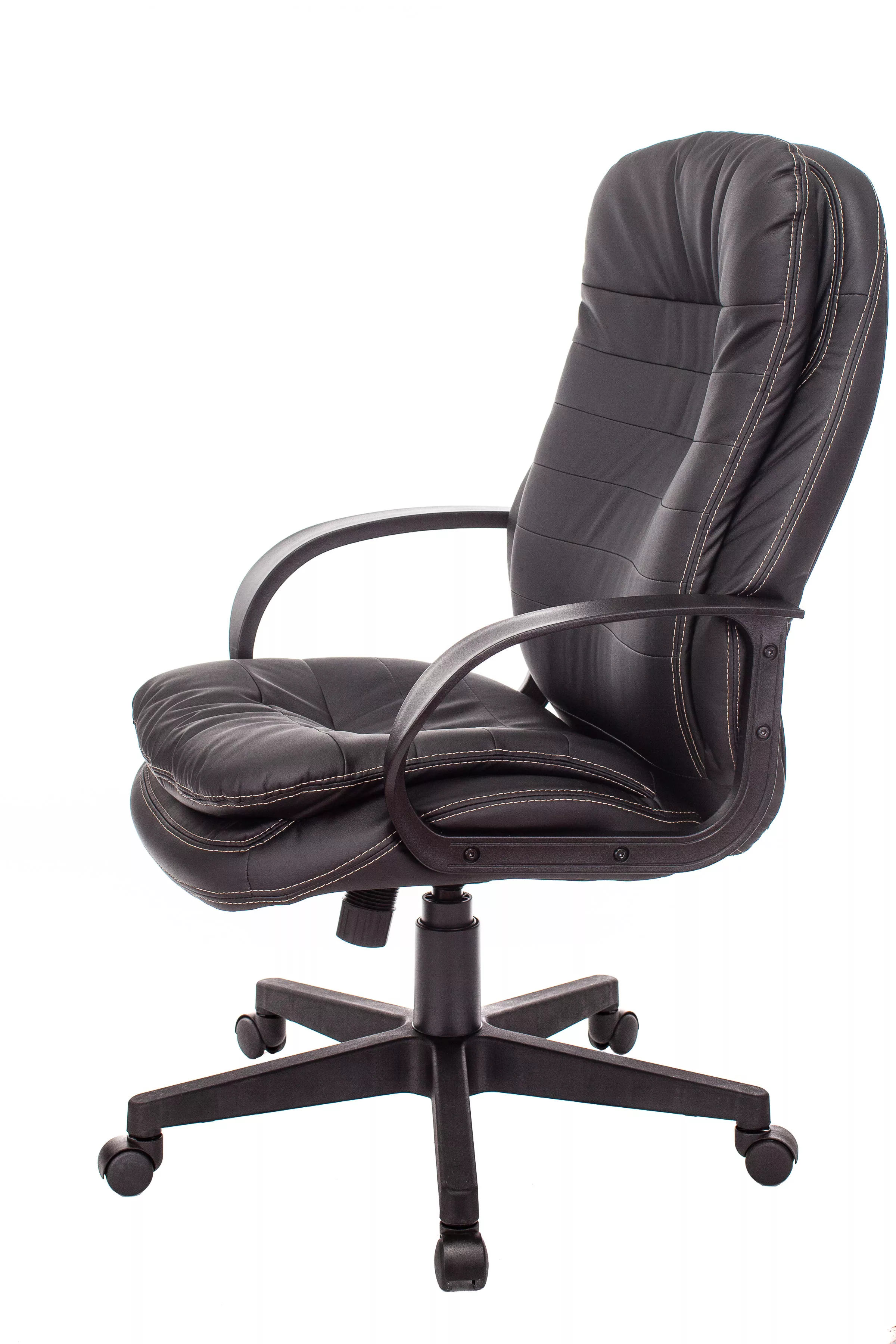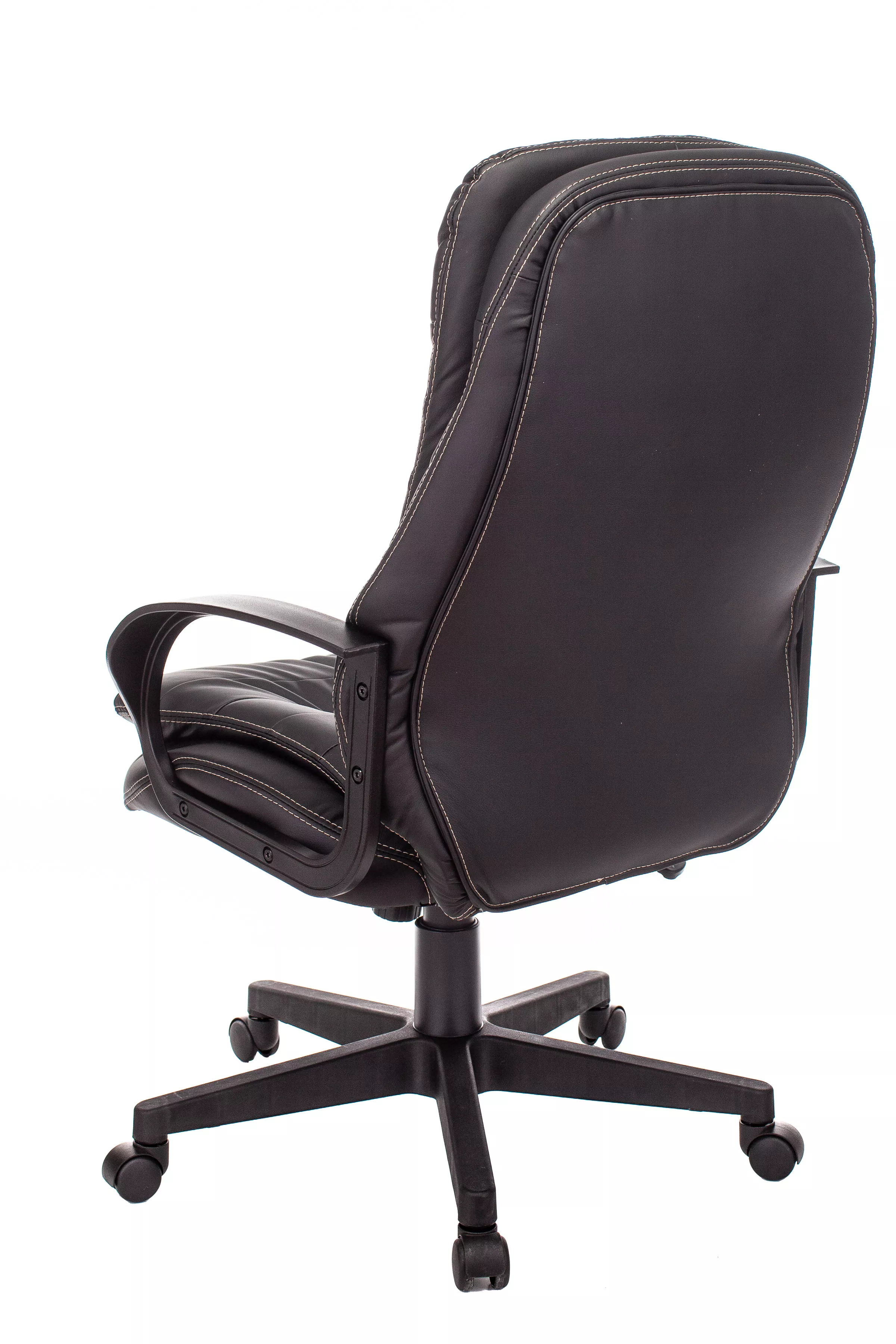 Обивка кресла выполнена из высококачественной экокожи черного цвета, которая не только стильно смотрится, но и легко чистится. Спинка кресла отделена от сиденья, что позволяет обеспечить лучшую вентиляцию и комфорт при длительном сидении. Высота кресла варьируется от 1065 мм до 765 мм с подлокотниками, а высота сиденья составляет 495 мм. Ширина сиденья — 565 мм, а глубина — 460 мм, что обеспечивает достаточное пространство для комфортного размещения.