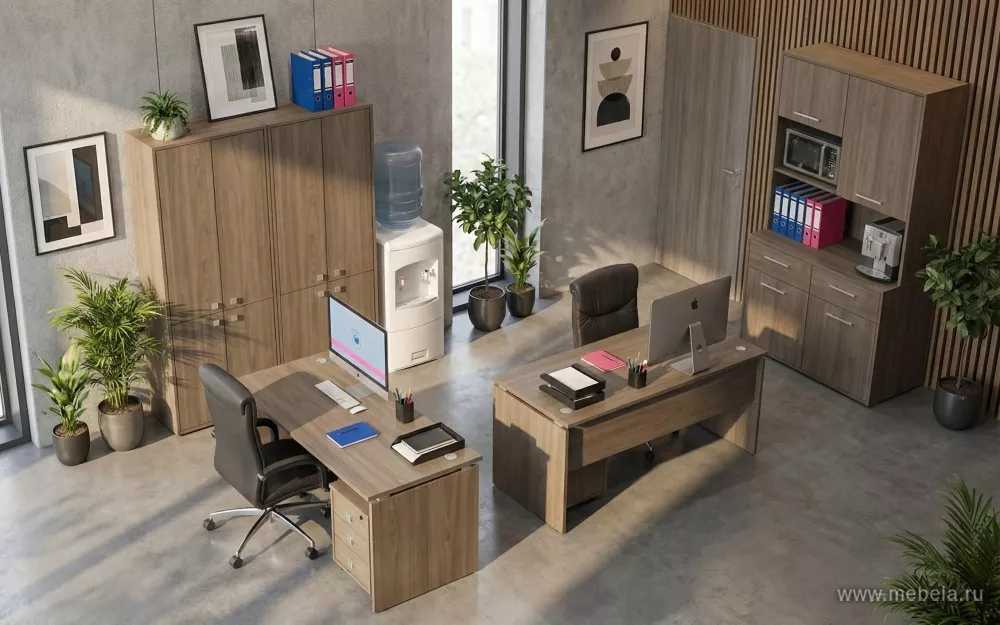 Офисная мебель для персонала Стайл Вяз Российская мебель для рабочих мест, изготовленная из ЛДСП «Kronospan»: 22 мм для столешниц, каркасов тумб, приставок и стеллажей, и 18 мм для фасадов шкафов и тумб. Конструкция прочная, аккуратная, исполнение в цвете Вяз Благородный.