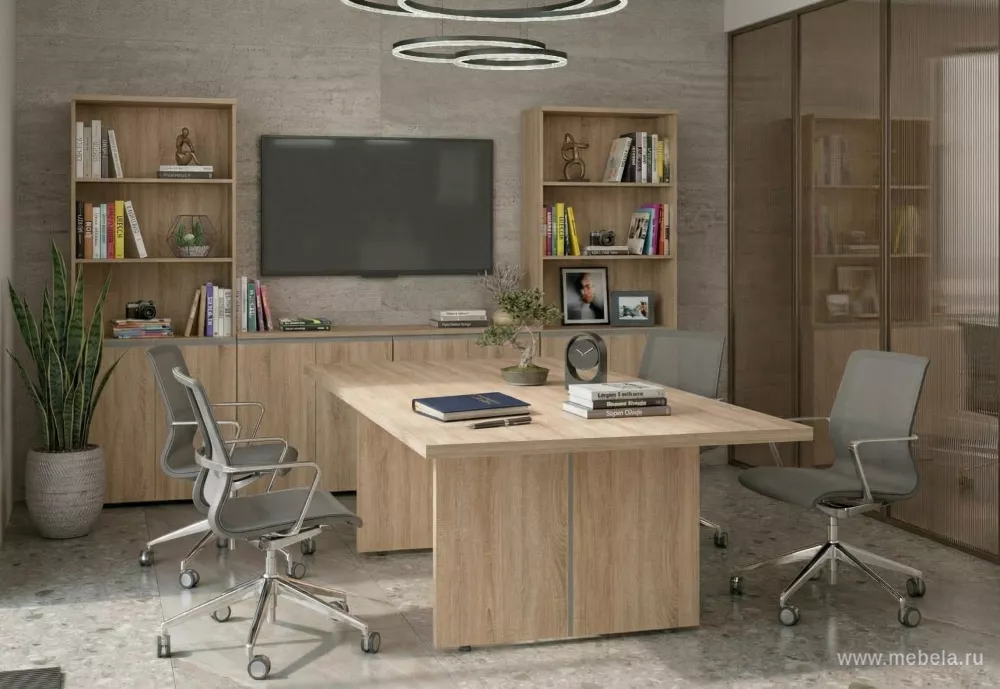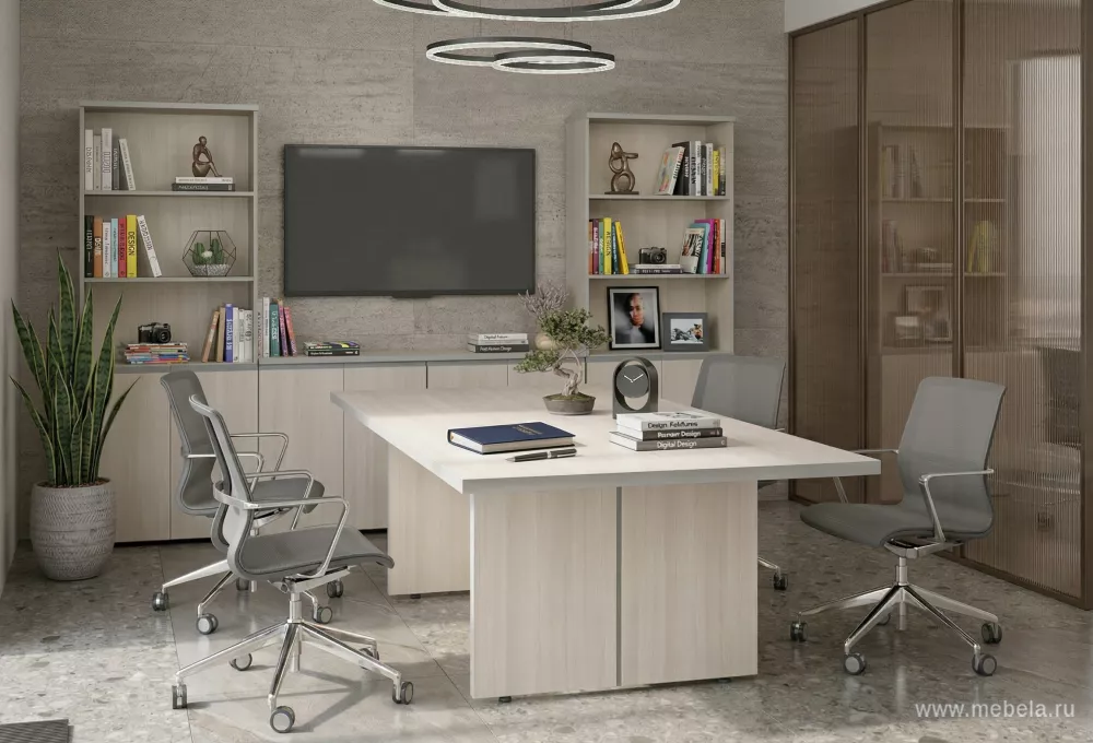 Прямые эргономичные формы мебели, современный лаконичный дизайн в стиле Хай-Тек и продуманная функциональность делают кабинет руководителя Белла Вита (Bella Vita) строгим и презентабельным. Обстановка универсально подходит и мужчинам, и бизнес-леди: мягкие белые и светлый тона мебели оживляют деловую атмосферу.